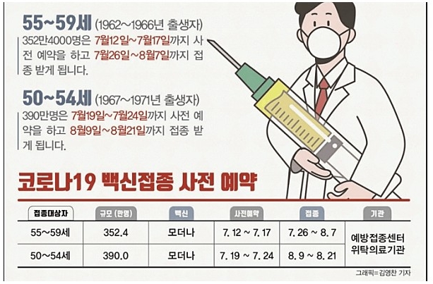 | 55~59세 (1962~1966년생) | 12~17일 | 7월 26일~8월 7일 | 모더나 |