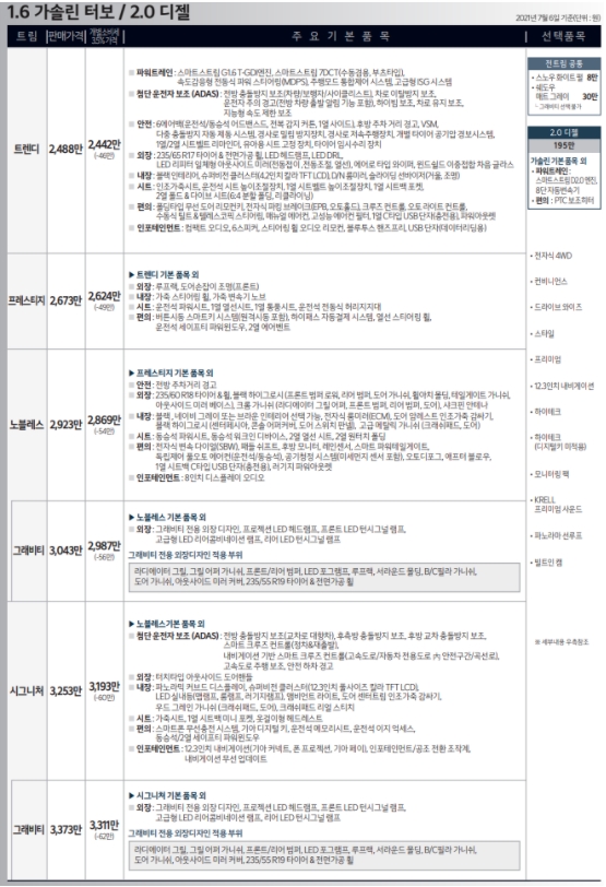 기아 스포티지 가격표를 보면 1.6터보 가솔린 차량이 2442~3193만원이고 2.0디젤 차량이 2634~3385만원으로 책정이 되었습니다. 1.6 가솔린 터보 하이브리드 모델의 경우 추후 공개가 될 예정이라고 합니다. 나중에 하이브리드도 공개되면 또 정리해서 깔끔하게 포스팅 하려고 합니다.