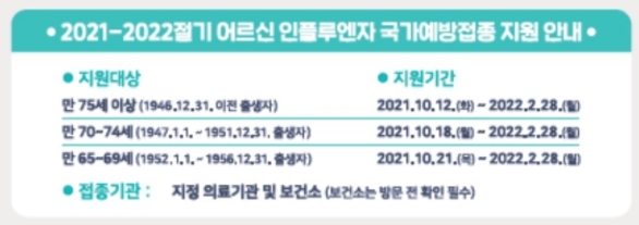 | 65세 이상 어르신(880만명) | 만 75세 이상 (1946년 12월 31일 이전 출생) | 2021년 10월 12일~2022년 2월 28일 |