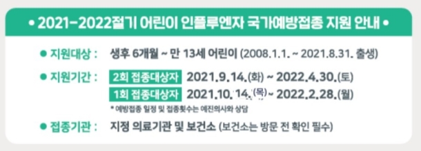 어린이의 경우는 생후 6개월 이상 부터 만 13세 어린이까지 입니다. 2008년 1월 1일생부터 2021년 8월 31일까지 출생