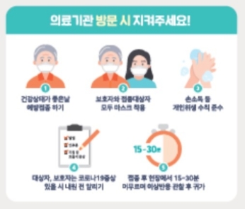 - 의료기관 방문시 비누와 물로 손씻기나 65% 이상 알코올로 손 위생을 실시합니다.