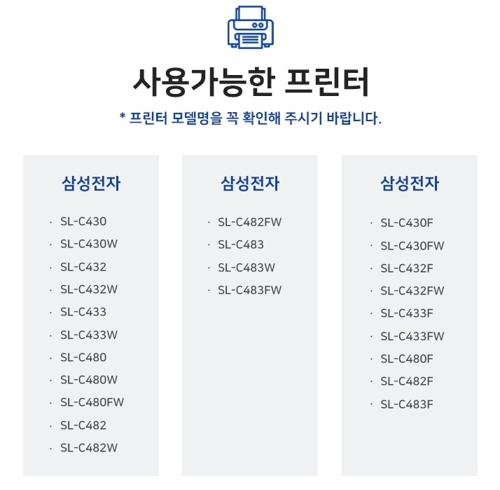 해당 토너의 사용 가능한 프린터를 구매 페이지 하단에서 확인이 가능합니다.