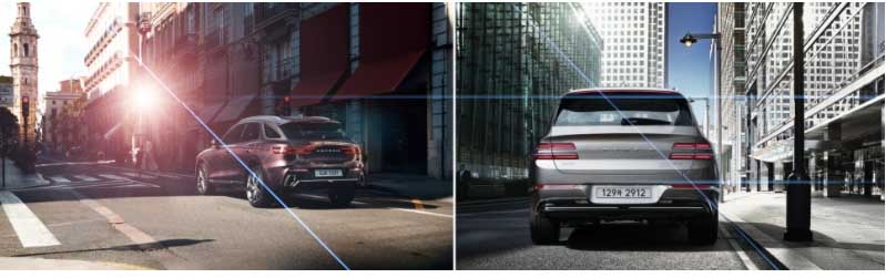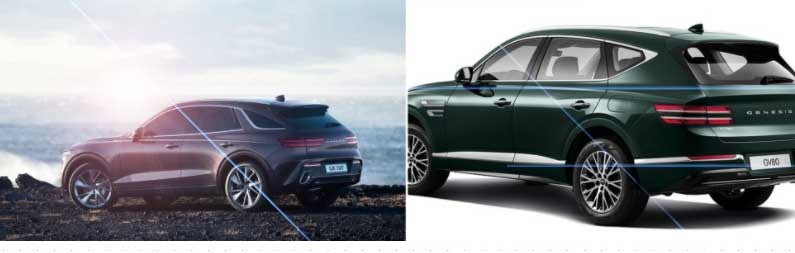 제네시스 GV70 전장의 경우 BMW X3와 비슷합니다. 싼타페 DM 보다는 조금 더 긴 전형적인 중형 SUV 입니다. GV80의 경우 공기저항을 줄이는 유선형의 형상을 채택하였으며 특히 루프라인이 상당히 낮고 경사져 있는 점이 BMW X6 와 비슷한 쿠페형 SUV 디자인 느낌은 아니지만 포르쉐 카이엔이나 재규어 F페이스, 랜드로버 레인지로버 벨라 처럼 스포티한 면이 있습니다. 느낌은 뒷면부가 좀 작고 낮아 보입니다.