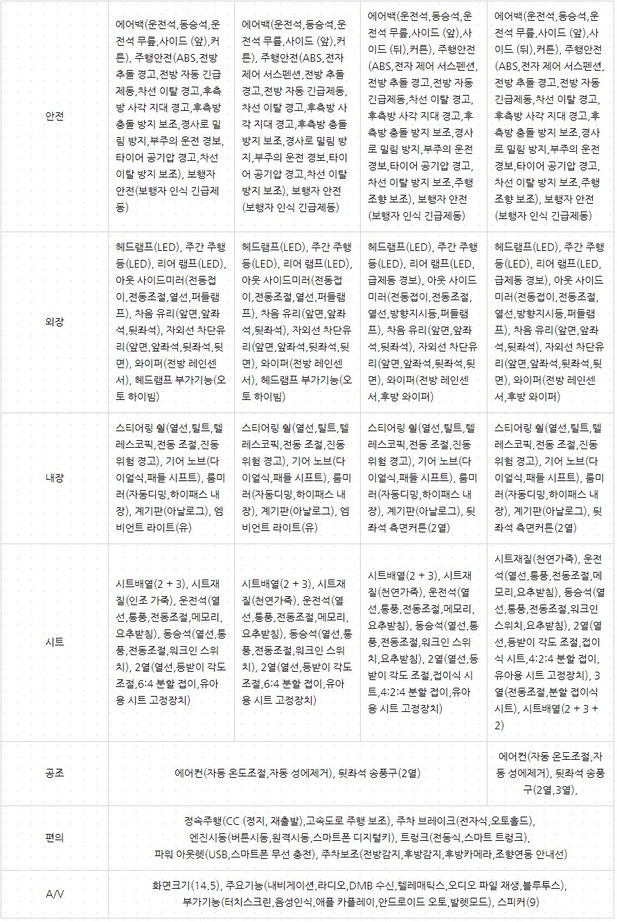 | 차량가격 | 47,910,000 | 50,860,000 | 60,670,000 | 65,090,000 |