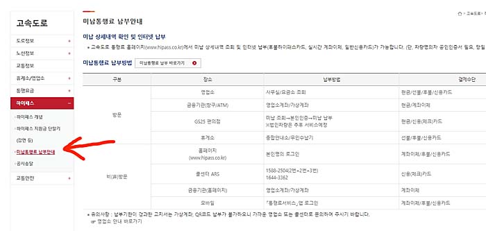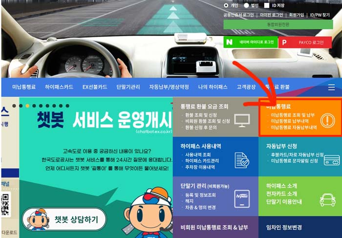 메뉴에서 보면 하이패스 항목에 미납통행료 납부안내라는 메뉴가 있습니다. 여기서 미납요금 조회 화면으로 이동이 가능합니다.