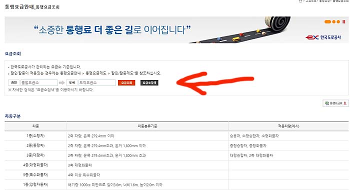 한국도로공사의 홈페이지 화면에서 휴게소, 통행료 항목에 보면 통행요금이 있습니다.