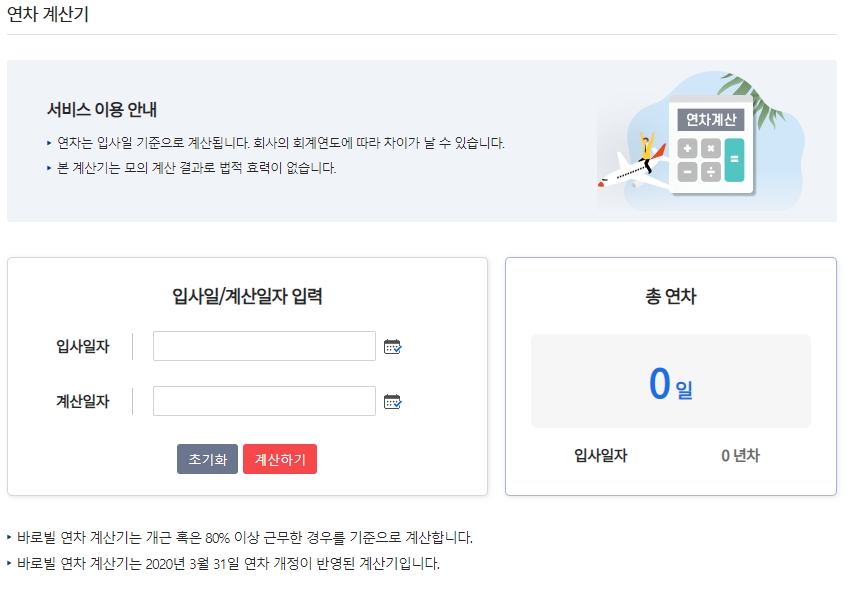 다양한 곳에서 제공하는데 저는 바로빌에서 할 수 있는 무료 연차 계산법 서비스를 이용해보았습니다.