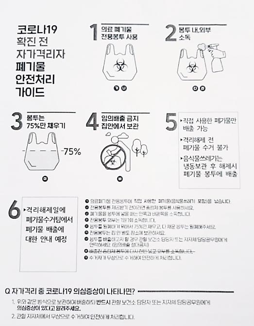 - 자가 격리자 방에서 배출되는 쓰레기는 분리수거 하지 말고 코로나바이러스 감염증-19 관련 폐기물 안전관리 특별대책 을 참고합니다.