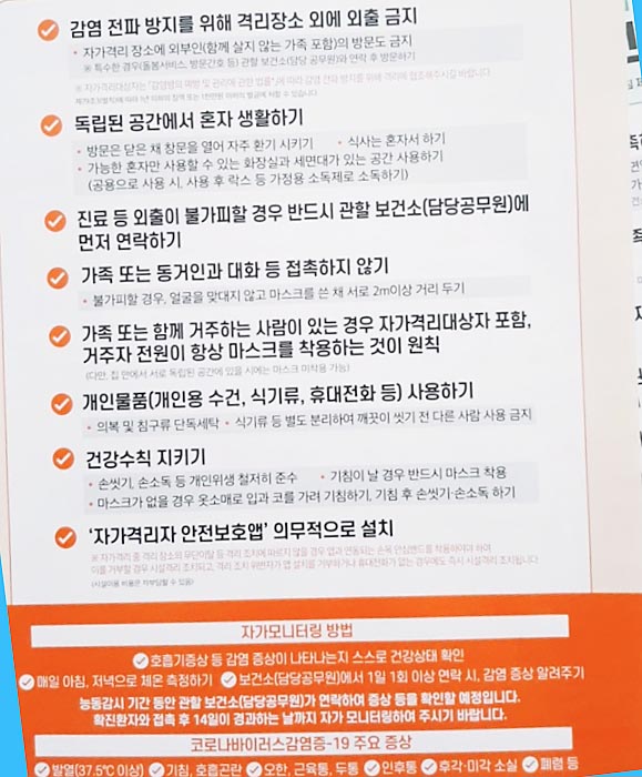 - 관할 보건소에서 하루에 한번 이상 연락을 합니다. 이때 감염이 의심되는 증상이 있다면 증상을 알려줘야 합니다. 매일 아침과 저녁에 체온을 측정하고 호흡기 증상 등 감염 증상이 있는지 스스로 건강상태를 체크합니다.