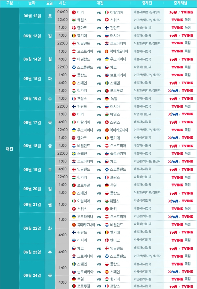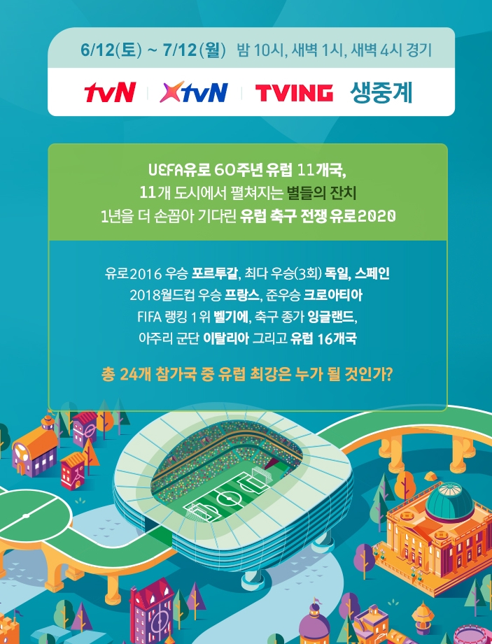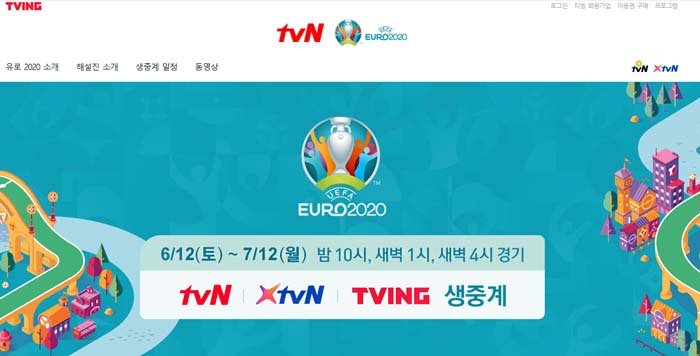 tvn을 이용하면 역시 유로 2020 중계를 볼 수 있습니다. TVN과 XTVN, TVING 에서 각각 나누어서 중계가 됩니다.
